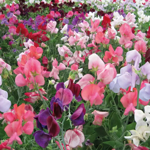 Sweet peas (Lathyrus odoratus) are prized for their old-fashioned fragrance, delicate form, and a palette ranging from the palest pinks and violets to richly saturated reds, blues, and purples. Centuries of classical plant breeding have given us diverse floral forms, including bicolor, streaked, and picotee patterns; larger, lovelier multiflora and ruffled types; and, more recently, varieties that extend the bloom season with low-light and cool tolerance, such as the Elegance series, or heat and drought tolerance, such as Mammoth Choice Mix.