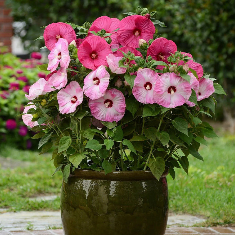 The flowers on Mix Hibiscus are the size of dinner plates, and they almost hide the foliage at the height of bloom season, crowding onto well-branched but compact plants just 2 to 3 feet tall and about 2 feet wide. Expect the first buds to unfurl in midsummer, followed by dozens more before the season ends in late fall.