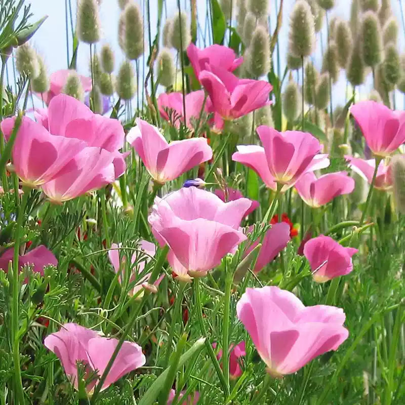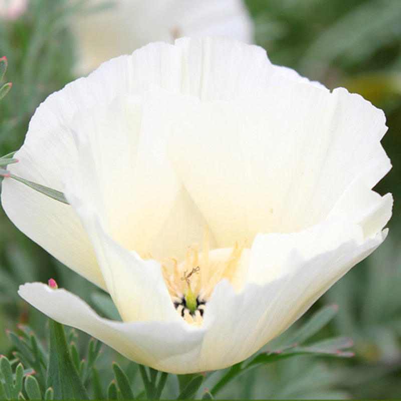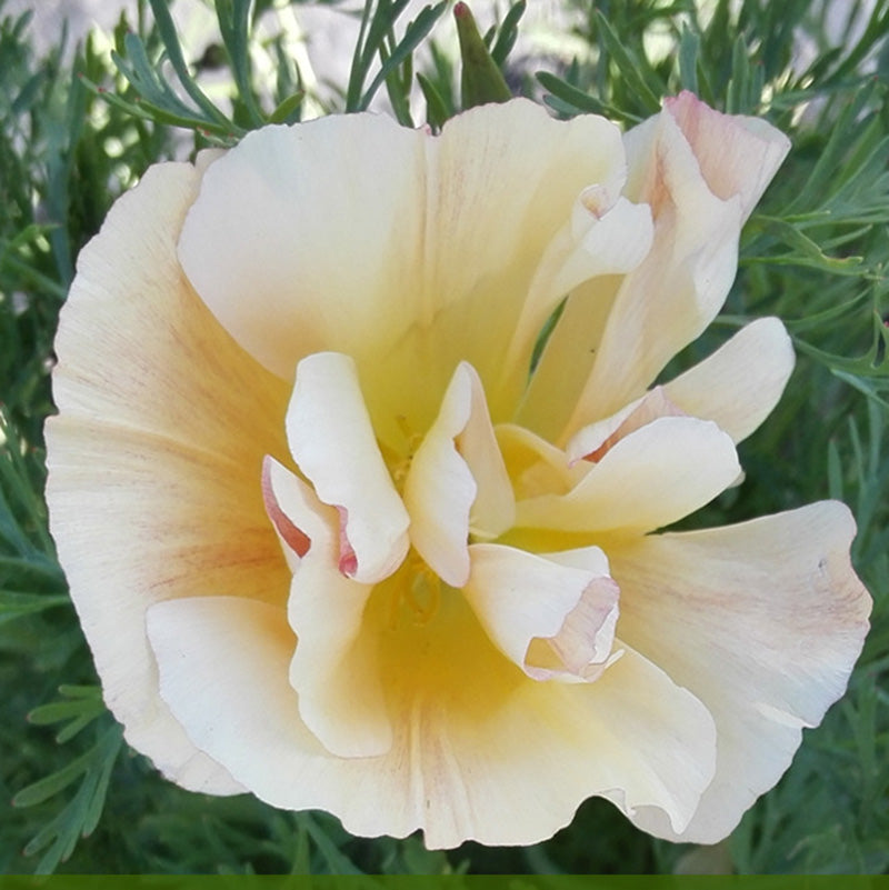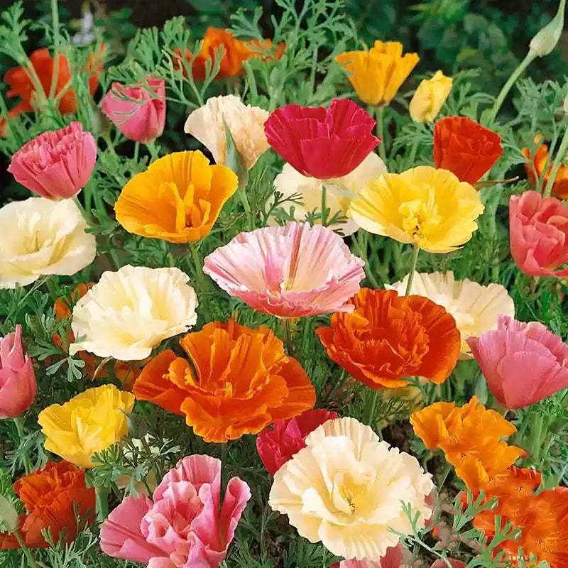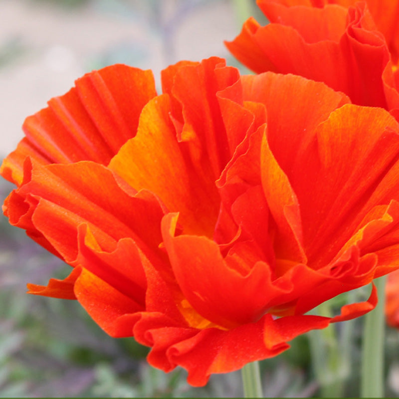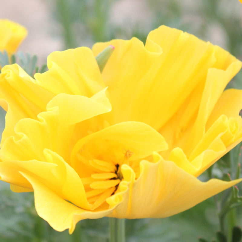 ‘Yukon Gold’ Poppy is a California poppy with brilliant blooms that feature petals of bright golden shades and centers of deeper orange hues. The slightly ruffled double blooms sit above lovely blue-green feathery foliage. This poppy variety is an easy to grow direct sow annual that will bloom from spring through summer. ‘Yukon Gold’ Poppy is spectacular when sown in drifts in sunny borders, but can also be used to fill gaps in the border and in mixed plantings with other annuals.