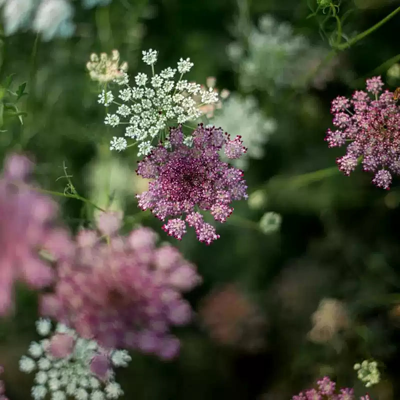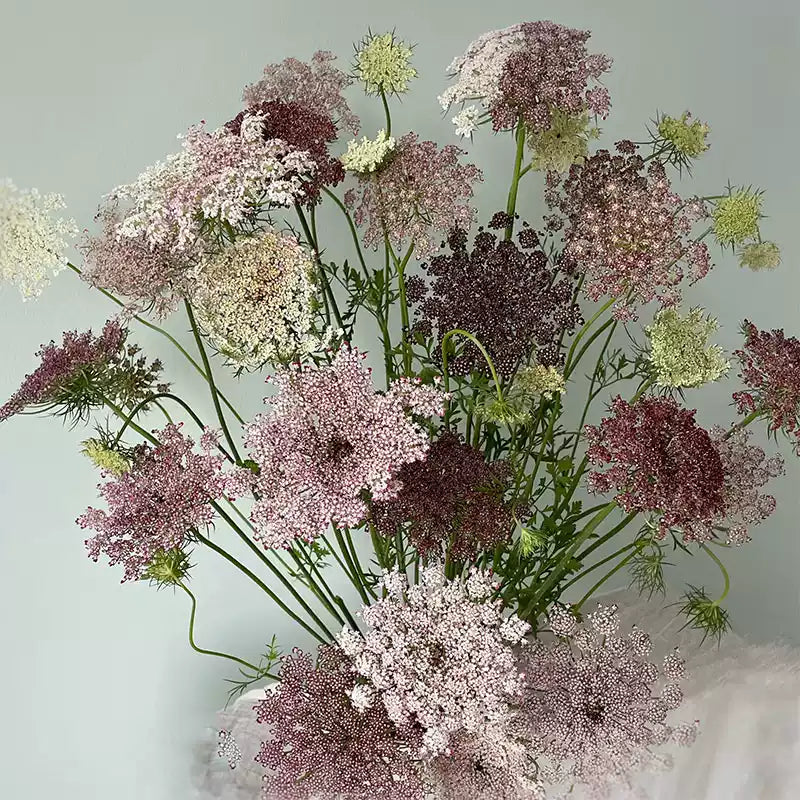 Purple Kisses is our substitute for Dara, which is a crop failure this year. Very similar to Dara, with 3–5″ lacy umbels atop strong, sturdy, upright stems. Flowers in shades of dark purple, pink, and approximately 15% white. Highly productive with 7–15 stems per plant. Long lasting in bouquets. Also known as Queen Anne’s lace, ornamental carrot, and wild carrot.