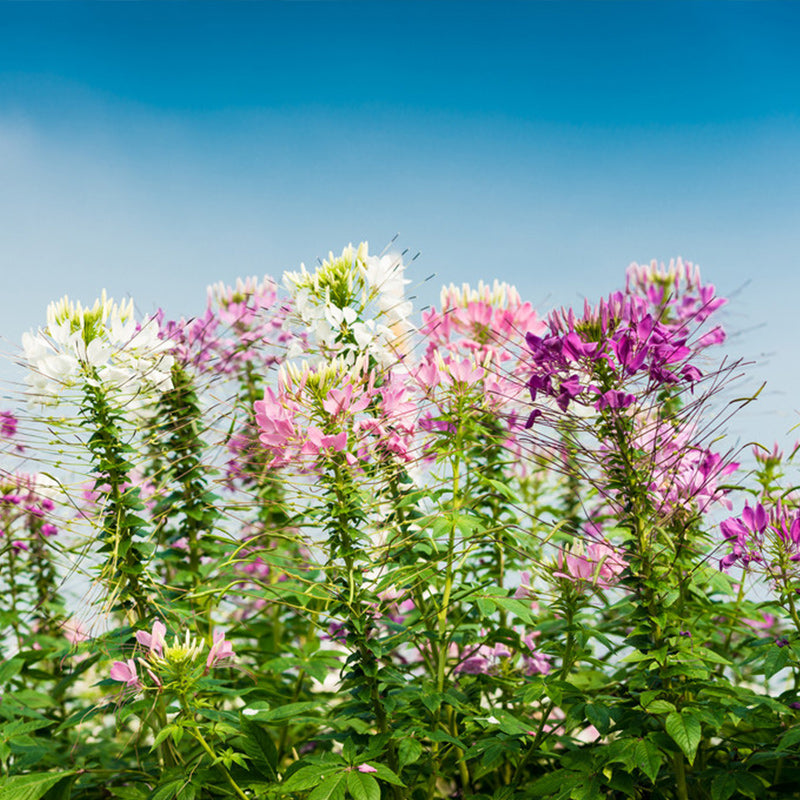 A riot of airy, long-blooming color on stately plants. This Queen Mix Spider Flower Seeds contains all 4 Queen series blooms: cherry-rose, vivid pink, clear white, and soft violet.