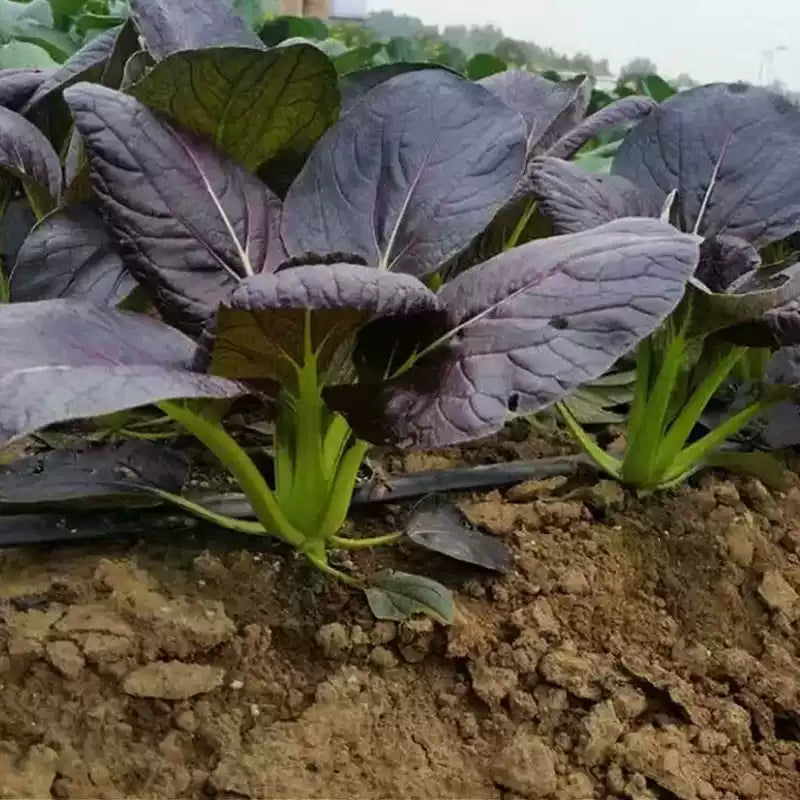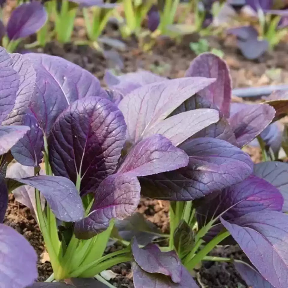 Standing out among various pak choi is Pak Choi Red Inferno with its striking dark red leaves and vibrant green undersides. As a type of Chinese cabbage, it thrives with ease and speed, forming loose, spoon-shaped leaves in a deep red hue with lighter veins and contrasting green stems, reaching approximately 10 inches in length. As temperatures drop, the resilient leaves intensify in their rich red color. Offering a slightly distinct flavor from traditional green pak choi, Red Inferno presents a sharper, more mustard-like taste in both leaves and stems, while maintaining its satisfying crunchiness.