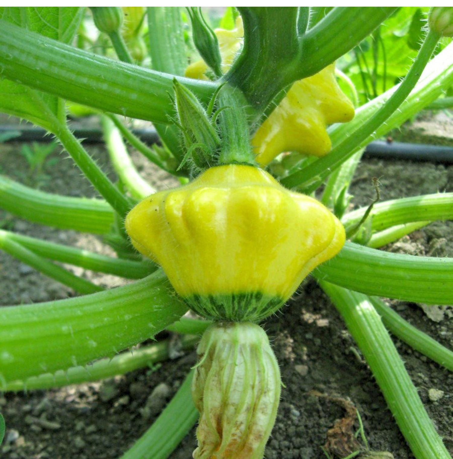 Bright yellow scalloped fruit is marked in fresh green at both ends, and sports huge flowers that can be eaten as well. The mild, buttery 3 by 2 inch fruits remain firm but very tender, even at full maturity. They are great for stuffing, because the rinds really hold up to cooking, yet never become tough.