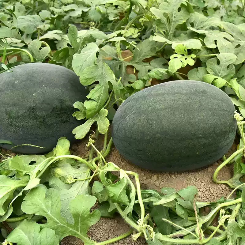 This dark colored watermelon has a thin shiny rind that holds a sweet and juicy interior. Usually around 13 pounds, this sugar baby type has a dark red color inside with a sweet crunch. The timing is right for harvesting when this fruit has a hollow sound and a yellow bottom.