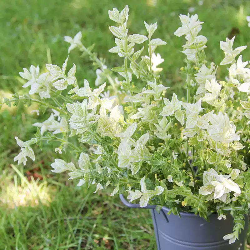 White Salvia is a compact tender perennial (Zones 8-10), typically grown as an annual. Highly floriferous, the well-branched plant blooms continuously from early summer to mid-fall, possibly to first frost. Whorls of two-lipped white flowers are borne on slender stems. Nectar and pollen rich, the long-lasting flowers attract pollinators, including bees, butterflies, and hummingbirds, and make excellent cuts for flower arrangements, fresh and dried.