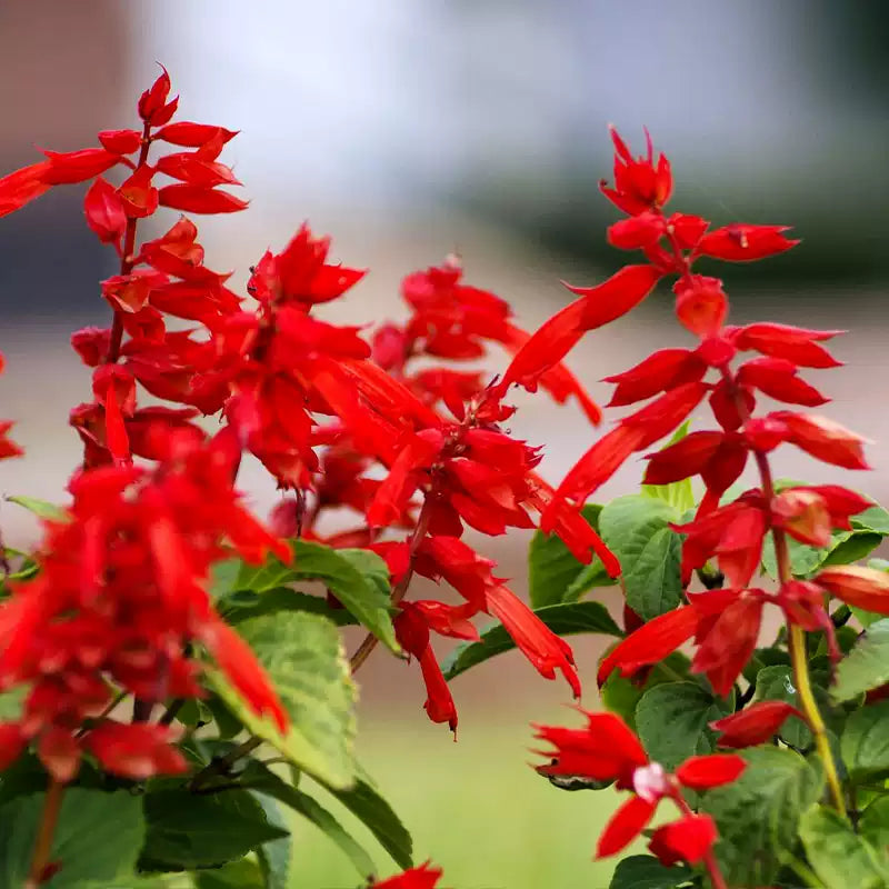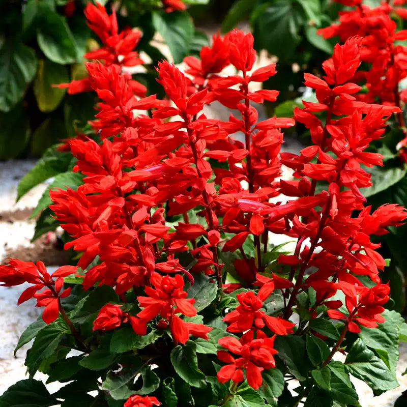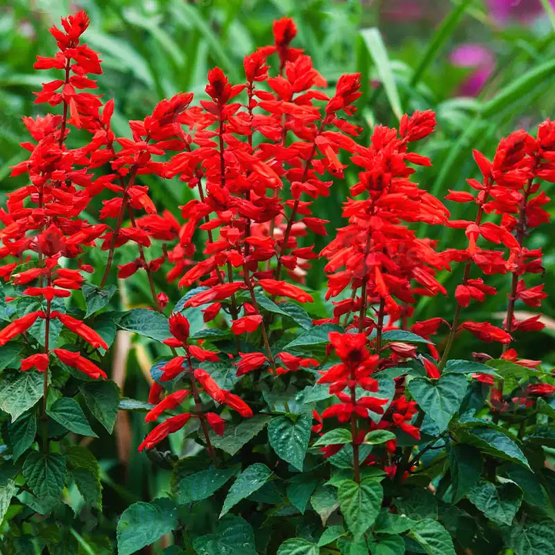 The blooms are fiery scarlet, and arise very densely on long, sturdy 8- to 10-inch spikes that shine like beacons above the foliage. Expect the first just 7 weeks from sowing, to be followed by countless others over a long, long summer season. Not only are these blooms far larger than other Salvias’, but they arise in big clumps for a very full, colorful look.