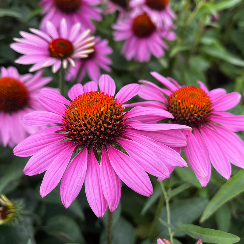 This plant reaches just 20 to 24 inches high when not in bloom, and spreads 12 to 16 inches wide. Despite this small size, it bears more blooms than just about any other echinacea we’ve ever grown. The flowers add another 9 to 12 inches to the plant’s height, giving you thick, long lasting stems for the vase. And you don’t have to keep up with pinching off the fading blooms.