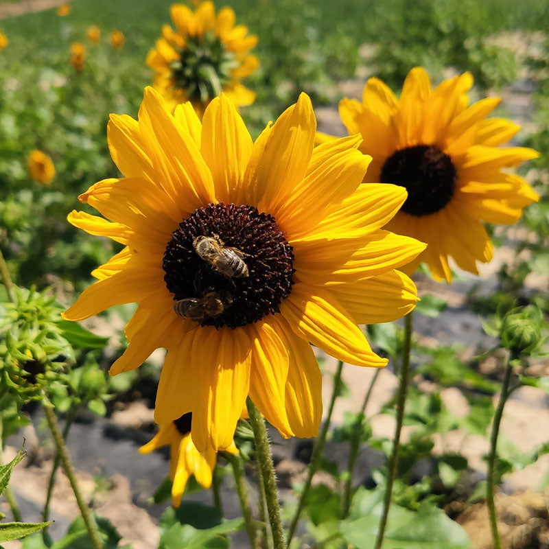 The seeds are easy to direct sow. Just pick a sunny spot with 6 to 8 hours of direct sun, moderately fertile, humus-rich, neutral to alkaline, moist soil, and good drainage, preferably sheltered from the wind. Rake to a fine tilth, clearing stones and weeds; plant seeds ½ to 1 ½ inches deep, spaced 18 inches apart; cover thoroughly with soil; and water regularly. Applying a light application of fertilizer at time of planting and watering deeply but infrequently, once the plant is established, promotes deep rooting. And succession planting, sowing a new row every two to three weeks, will keep sunflowers coming right up to the first frost.